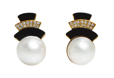 A Pair of 18 Karat Yellow Gold, Mabe Pearl, Onyx and Enamel Earclips,