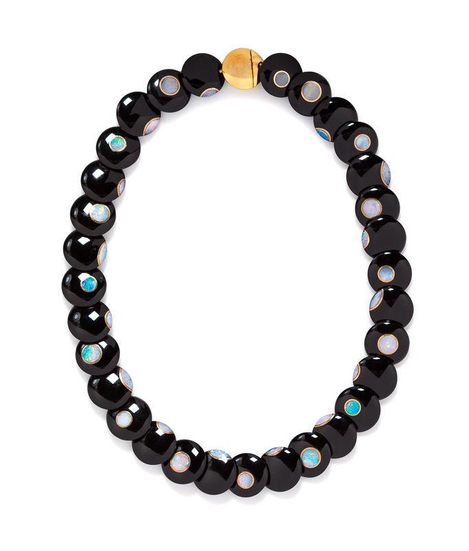 consisting of 31 onyx discs measuring approximately 18.00 mm in diameter, inlaid with a round and half moon shape opal plaques framed by yellow gold.Stamp: 585 (maker's mark).