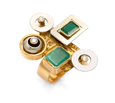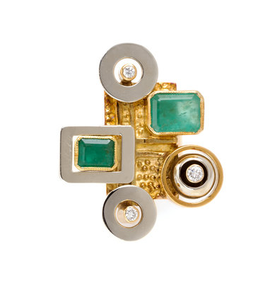 in an abstract sculptural form with beaded texture accents, containing two octagonal step cut emeralds measuring approximately 7.30 x 5.45 x 4.59 mm and 10.18 x 7.79 x 5.49 mm respectively and three round brilliant cut diamonds measuring approximately 0.23 carat total.Stamp: 750.
