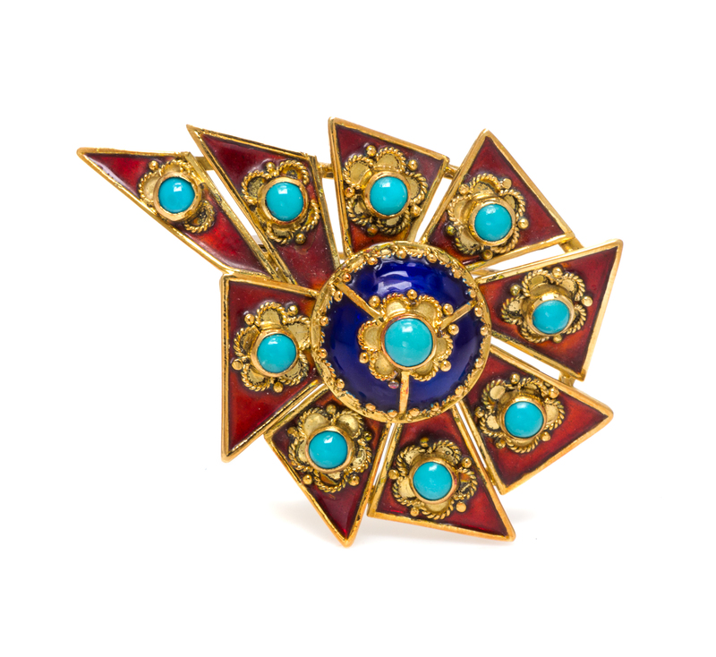 A Yellow Gold, Turquoise and Polychrome Enamel Brooch,