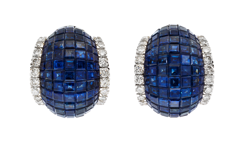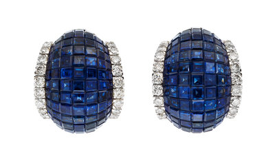 A Pair of 18 Karat White Gold and Invisibly Set Sapphire and Diamond Earclips,