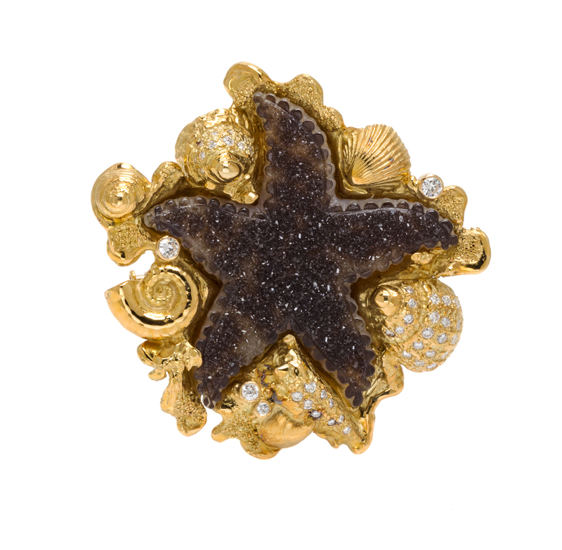 in a sea life motif, containing one carved druzy agate plaque depicting a starfish set within a surround depicting various sea creatures and accented with 40 round brilliant cut diamonds weighing approximately 0.81 carat total.Stamp: GAGE 750 (British assay marks).Accompanied by a pouch signed Elizabeth Gage.