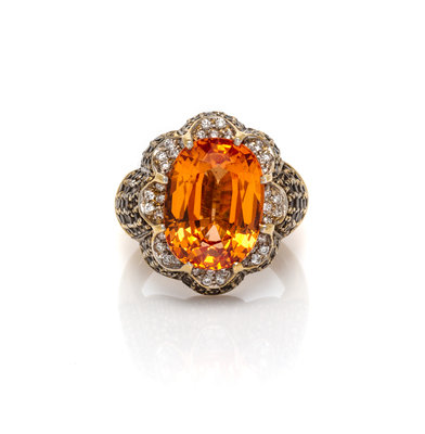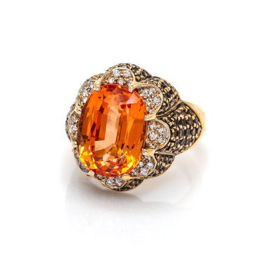 An 18 Karat Yellow Gold, Orange Sapphire, Diamond and Colored Diamond Ring,
