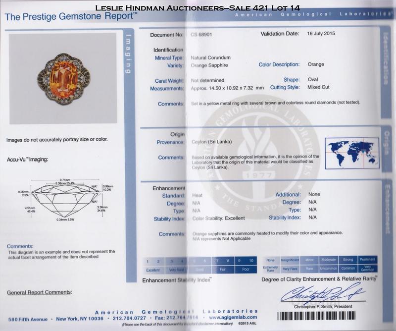 containing one cushion cut sapphire weighing approximately 10.90 carats and measuring approximately 14.53 x 10.91 x 7.40 mm, together with 40 round brilliant cut diamonds weighing approximately 0.34 carat total, and 114 round brilliant cut brown diamonds (origin of color not tested) weighing approximately 1.03 carats total.Stamp: 750.Accompanied by an American Gemological Laboratories sapphire identification and origin certificate number CS 68901, dated July 16, 2015, stating Mineral Type: Natural Corundum, Variety: Orange Sapphire, Origin: Ceylon (Sri Lanka), Enhancement: Heat, Clarity Enhancement: None.