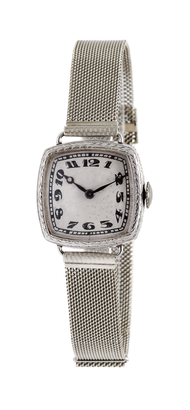 platinum cushion form case, white dial, Arabic numerals, black moon hands, intricately engraved bezel and outer band, snap on case back, manual wind mechanical movement, adjustable mesh bracelet, openwork box clasp containing 18 round single cut diamonds weighing approximately 0.18 carat total.Stamp: 18K (partially obscured).
