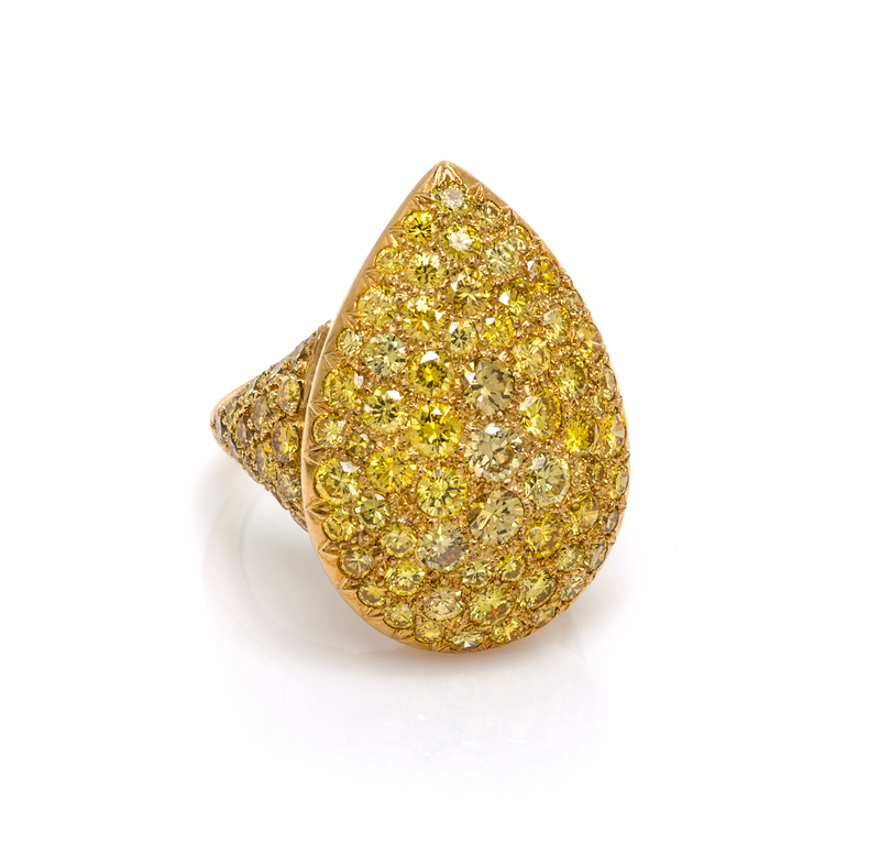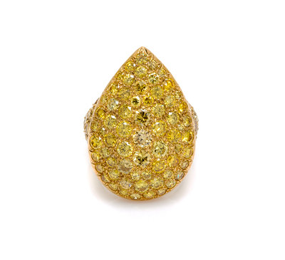 in a low dome pear shape design, containing numerous pave set round brilliant cut yellow diamonds (origin of color not tested) weighing approximately 4.18 carats total. Stamp: (partially obscured) 434.