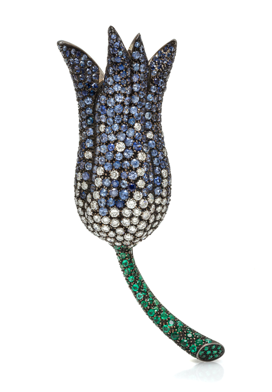 in a flower blossom motif, the setting plated in black rhodium, containing 108 round brilliant cut diamonds weighing approximately 3.24 carats total, 82 round mixed cut tsavorite garnets measuring approximately 1.34-2.00 mm in diameter, and 67 round mixed cut sapphires measuring approximately 1.54-2.11 mm in diameter. Stamp: 750 (Italian maker's mark).