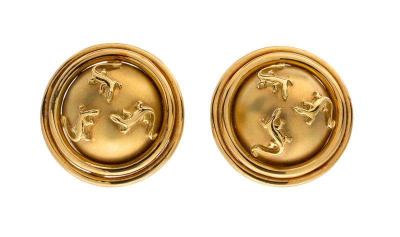 in a domed matte finish design with three raised lizard motif accents within a fluted outer border. Stamp: 18K B.H. 780.