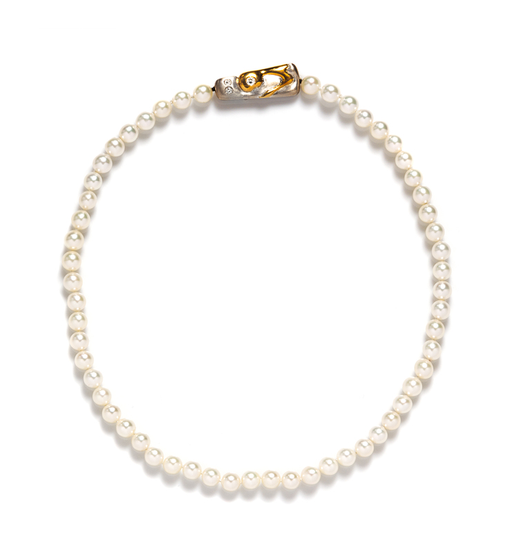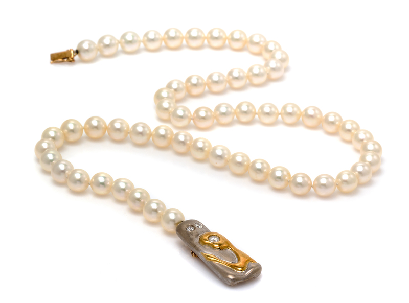 containing numerous pearls measuring approximately 8.06-8.39 mm in diameter, strung knotted with a sculpted white and yellow gold clasp containing three round brilliant cut diamonds weighing approximately 0.34 carat total, clasp is removable for use as separate brooch.Stamp: 750 18K.
