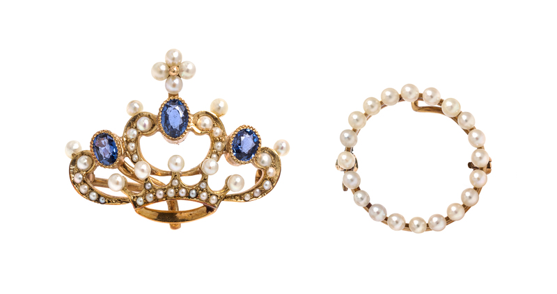 consisting of a crown motif pin in an openwork design containing three oval shape mixed cut sapphires and numerous seed pearls, together with a circular pin containing 20 seed pearls, both with hidden wirework suspension hooks allowing wear as pendants.