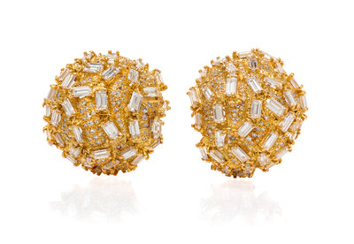 A Pair of 14 Karat Yellow Gold and Diamond Bombe Earclips,