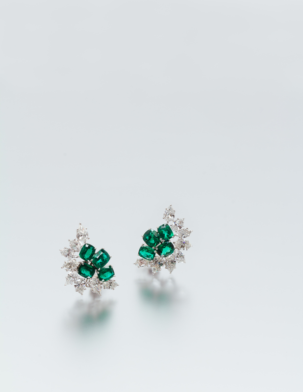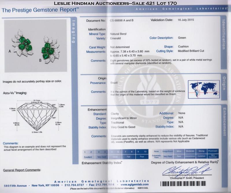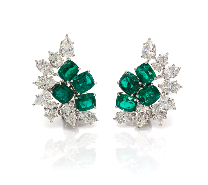 in an openwork cluster style, containing eight cushion cut emeralds weighing approximately 7.50 carats total, together with six marquise cut diamonds weighing approximately 2.27 carats total and 10 pear shape diamonds weighing approximately 4.30 carats total.Stamp: FCC Plat.Accompanied by an American Gemological Laboratories emerald identification and origin certificate number CS 68898 A and B, dated July 16, 2015, stating Mineral Type: Natural Beryl, Variety: Emerald, Origin: Brazil, Clarity Enhancement: Insignificant to Minor, Type: Traditional.