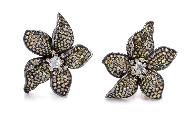 in a floral motif, the settings black rhodium plated, one brooch containing one old mine cut diamond measuring approximately 6.33 x 5.50 mm, ten rose cut diamonds measuring approximately 1.80 mm in diameter, and 243 round brilliant cut colored diamonds weighing approximately 8.26 carats total, the second brooch containing one old mine cut diamond measuring approximately 7.78 x 7.70 mm, ten rose cut diamonds measuring approximately 1.80 mm in diameter, and 243 round brilliant cut colored diamonds weighing approximately 8.26 carats total, (origin of color not tested for colored diamonds).Accompanied by a case signed Gioia.