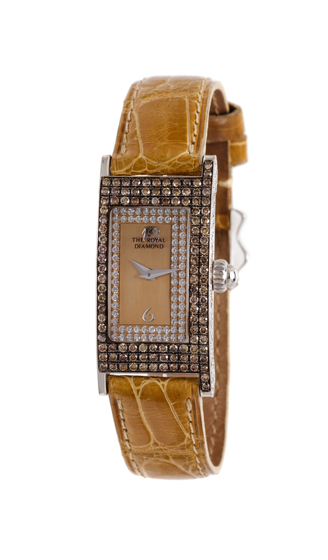 39.00 x 18.70 mm case dimensions, the bezel containing 112 round brilliant cut brown diamonds weighing approximately 2.24 carats total, origin of color not tested, the dial containing 69 round brilliant cut diamonds weighing approximately 0.69 carat total, one side of the case set with 65 round brilliant cut diamonds weighing approximately 0.65 carat total, champagne dial signed THE ROYAL DIAMOND, applied silvered Arabic numerals, silvered dauphine hands, rectangular case, quartz movement, mustard color crocodile strap, 18 karat white gold tang buckle.Caseback stamp: The Royal Diamond Prestige BA78 750 No. 74.Buckle stamp: 750 N.G.
