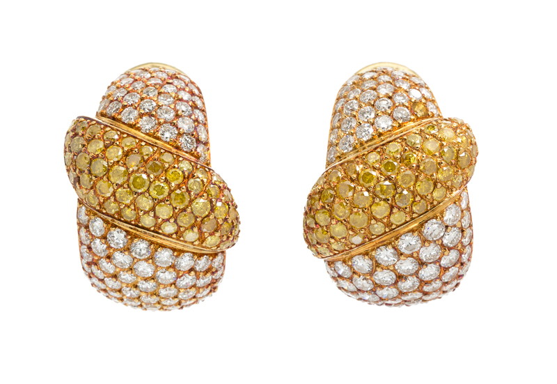 in an overlapping domed design, containing numerous pave set round brilliant cut yellow diamonds (origin of color not tested) weighing approximately 2.58 carats total, and numerous pave set round brilliant cut diamonds weighing approximately 2.41 carats total.Stamp: 750.