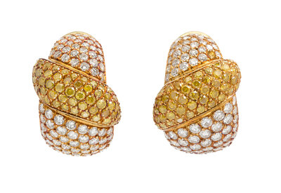 A Pair of 18 Karat Yellow Gold, Colored Diamond and Diamond Earclips,
