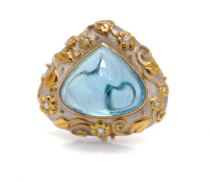 An 18 Karat Two Tone Gold, Aquamarine and Diamond Brooch, Elizabeth Gage,