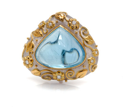 containing one triangular cabochon cut aquamarine measuring approximately 37.00 x 31.00 x 22.00 mm, and seven round brilliant cut diamonds weighing approximately 0.40 carat total. Stamp: GAGE 750 (British assay marks).