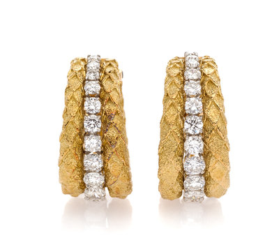 A Pair of 18 Karat Yellow Gold, Platinum and Diamond Earclips, David Webb,