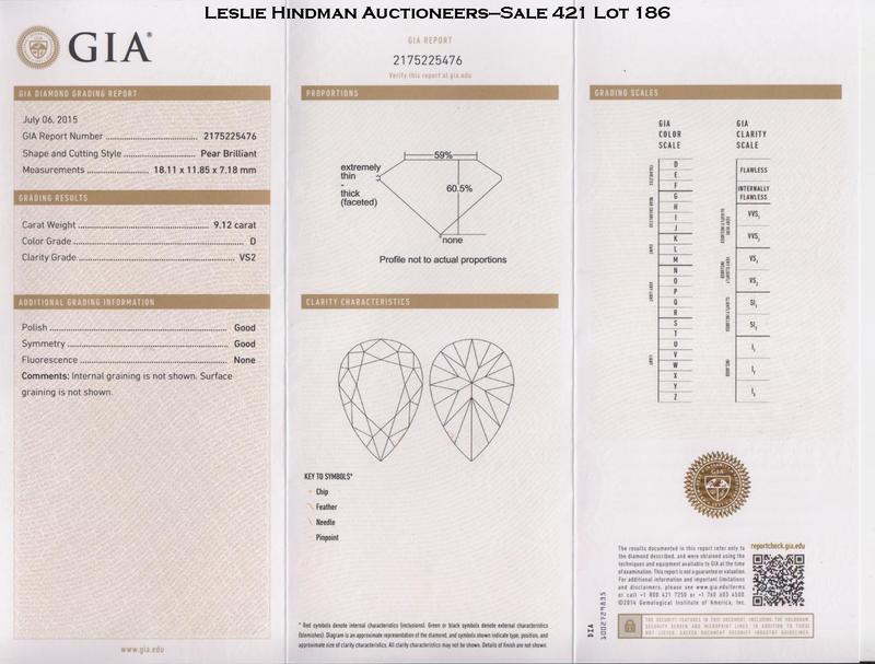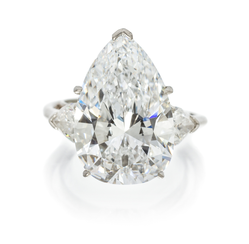 containing one pear shape brilliant cut diamond measuring approximately 18.11 x 11.85 x 7.18 mm, weighing approximately 9.12 carats and two pear shape brilliant cut diamonds weighing approximately 1.27 carats total, within a handmade wirework setting.Stamp: 950 Pt (maker's mark partially obscured by ring guard). Accompanied by a Gemological Institute of America diamond grading certificate number 2175225476, dated July 6, 2015, stating Color: D, Clarity: VS2, Table: 59.00%, Depth: 60.50%, Polish: Good, Symmetry: Good, Fluorescence: None.Accompanied by a pouch signed Harry Winston.NOTE:Please contact the Jewelry Department for further information on this stone based on a previous GIA certificate.