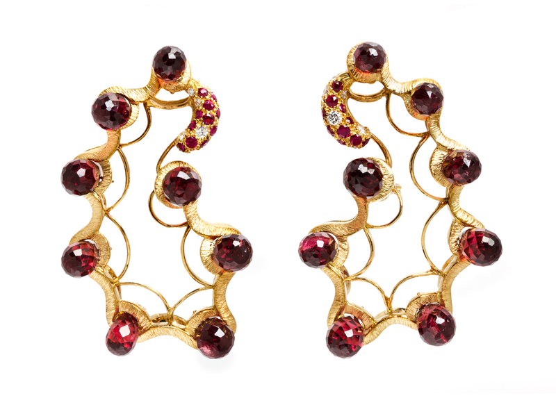 in an abstract openwork design with wirework accents, containing 16 upturned briolette cut purplish red sapphires measuring approximately 8.30 x 4.30 mm up to 8.30 x 5.40 mm, together with ten round brilliant cut diamonds weighing approximately 0.10 carat total, and 22 round mixed cut rubies weighing approximately 0.44 carat total.Stamp: N. VARNEY 18K.