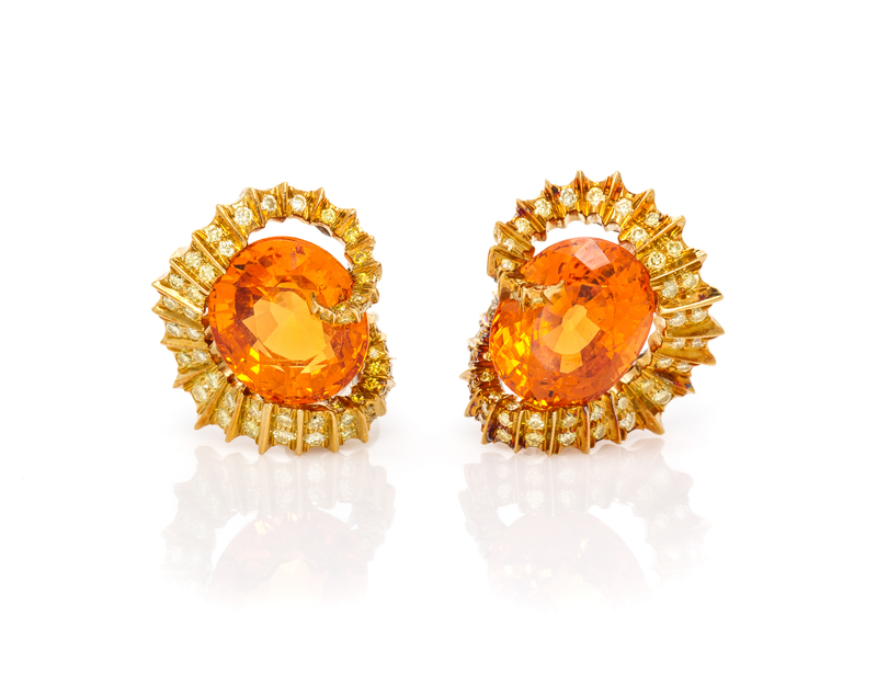 A Pair of 18 Karat Yellow Gold, Spessartite Garnet and Colored Diamond Earclips, N. Varney,
