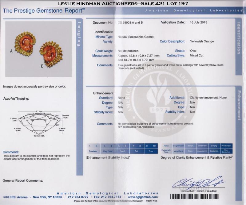 containing two oval shape mixed cut spessartite garnets, one weighing approximately 8.66 carats and measuring approximately 12.81 x 10.89 x 7.37 mm, the other weighing approximately 9.42 carats and measuring approximately 13.24 x 10.88 x 7.80 mm, and numerous round brilliant cut yellow diamonds (origin of color not tested) weighing approximately 1.02 carats total. Stamp: N. Varney 18K.Accompanied by an American Gemological Laboratories garnet identification and origin certificate number CS 68903 A and B, dated July 16, 2015, stating Mineral Type: Natural Spessartite Garnet, Enhancement: None.