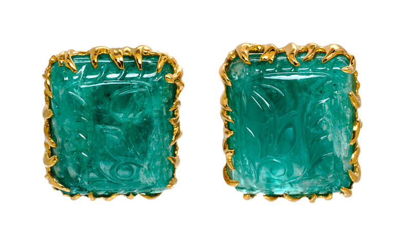 attributed to Tony Duquette, containing two rectangular domed emeralds carved in a foliate motif measuring approximately 24.27 x 20.13 mm.Stamp: 18K.