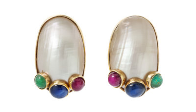containing two mabe pearls measuring approximately 31.00 x 19.60 mm, two round cabochon cut sapphires measuring approximately 7.33 mm in diameter, two round cabochon cut rubies measuring approximately 6.10 mm in diameter, and two round cabochon cut emeralds measuring approximately 6.00 mm in diameter.Stamp: Seaman Schepps 14K.