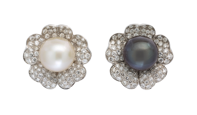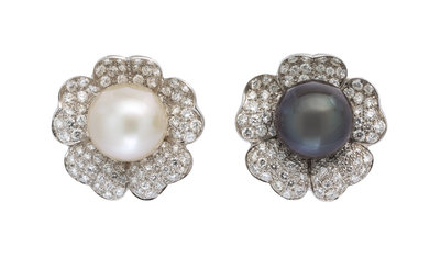 containing one Tahitian pearl measuring approximately 14.97 x 15.03 mm, one South Sea pearl measuring approximately 14.83 x 14.97 mm, and numerous pave set round brilliant cut diamonds weighing approximately 2.78 carats total.Stamp: 750.