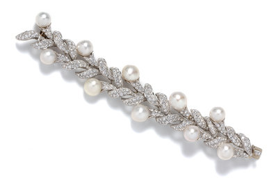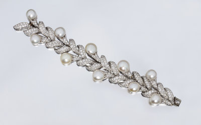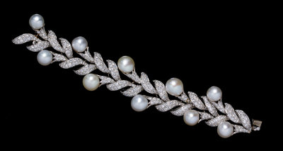in a stylized foliate motif, consisting of numerous overlapping platinum petals accented with 10 baroque pearls measuring approximately 11.35-13.84 mm in diameter, the petals containing numerous pave set round brilliant cut diamonds weighing approximately 21.00 carats total, hidden clasp.Accompanied by an additional platinum and diamond set link.Accompanied by an inner pouch and outer box signed Harry Winston.