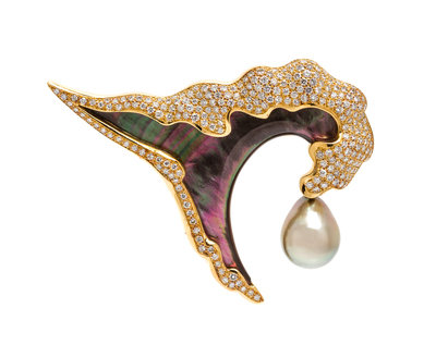 in a sculpted wave motif, consisting of a black mother-of-pearl plaque set within an undulating gold surround containing numerous pave set round brilliant cut diamonds weighing approximately 2.41 carats total, suspending a drop shape Tahitian pearl measuring approximately 15.02 x 11.82 mm.