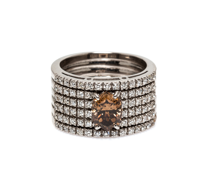 containing one fancy octagonal brilliant cut fancy deep yellow brown diamond (origin of color not tested) measuring approximately 7.63 x 5.67 x 3.45 mm and 78 round brilliant cut diamonds weighing approximately 0.78 carat total.