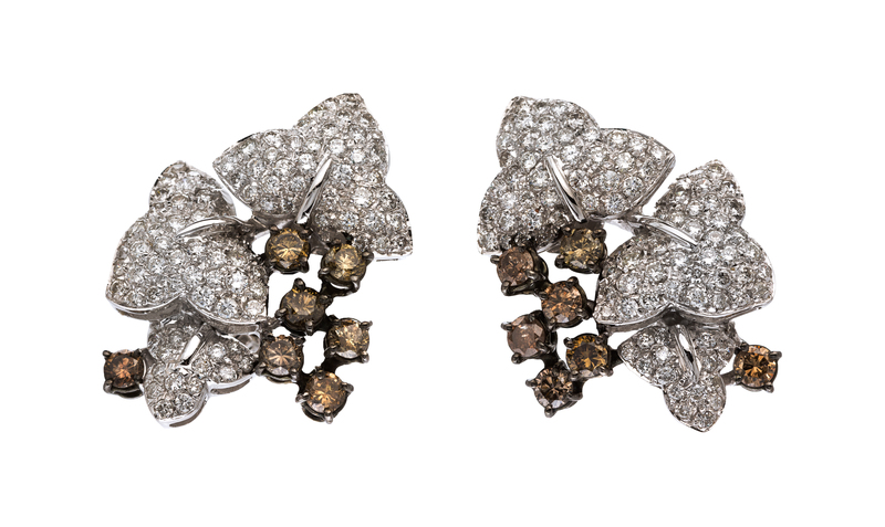 in an openwork foliate motif consisting of white gold leaves and blackrhodium plated buds, containing 14 round brilliant cut brown diamonds (origin of color not tested) weighing approximately 1.90 carats total, together with 188 round brilliant cut diamonds weighing approximately 2.25 carats total. Stamp: 750.
