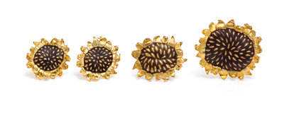 in a sunflower motif with textured and sculpted petals, consisting of a larger and smaller brooch together with a pair of matching earclips, the centers accented with matte finish translucent brown enamel over textured gold.Earclips and small brooch stamp: CUMMINGS 18K.Large brooch stamp: CUMMINGS 1992 18K.Accompanied by three pouches signed Angela Cummings.
