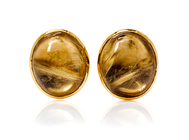 containing two oval cabochon cut rock crystal quartz included with golden color rutile needles, measuring approximately 25.00 x 20.00 mm within bezel settings.Stamp: 750.