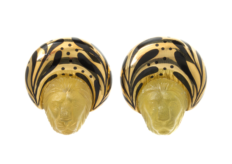 containing two carved yellow beryls depicting lion faces extending from the domed yellow gold main sections with intricate black enamel accents, the earclips measuring approximately 33.00 x 28.00 mm. Stamp: GAGE (maker's mark) (British assay marks) 750.