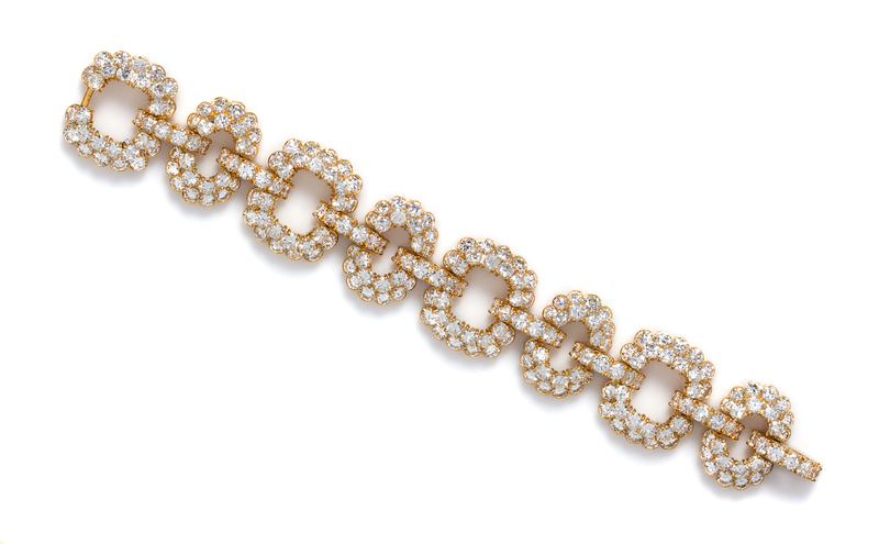 composed of alternating fluted cushion and oval form links joined with domed bar links, the bracelet containing 241 round brilliant cut diamonds weighing approximately 40.45 carats total. Stamp: 585 (maker's mark for VCA).Hand engraved: Van Cleef & Arpels N.Y. 45 679.Accompanied by a pouch signed Van Cleef & Arpels.