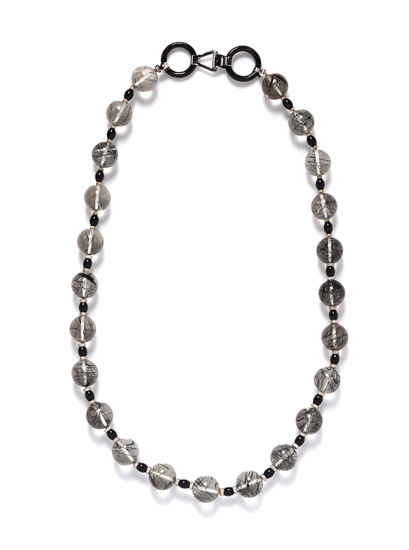 An 18 Karat White Gold, Onyx, Diamond and Tourmalinated Quartz Bead Necklace,