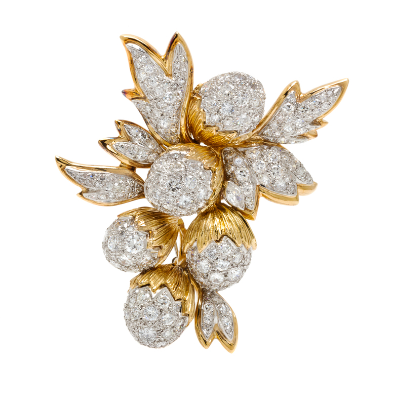 in a stylized oak branch motif with textured gold and articulated pave set acorns and fixed leaves, containing numerous round brilliant and round single cut diamonds weighing approximately 6.67 carats total and one marquise cut diamond weighing approximately 0.14 carat.