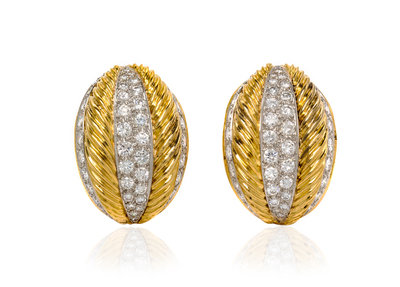 in a domed style alternating between vertical rows of rope texture gold and pave set diamonds, the earclips containing 96 pave set round brilliant cut diamonds weighing approximately 5.20 carats total.Hand inscribed: Van Cleef & Arpels N.Y. 46048.Accompanied by a pouch signed Van Cleef & Arpels.