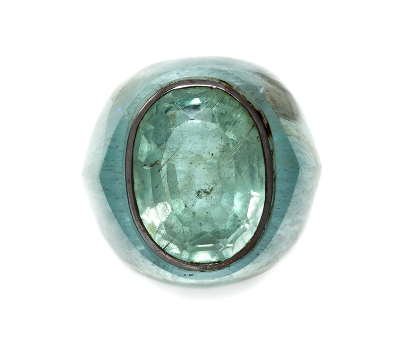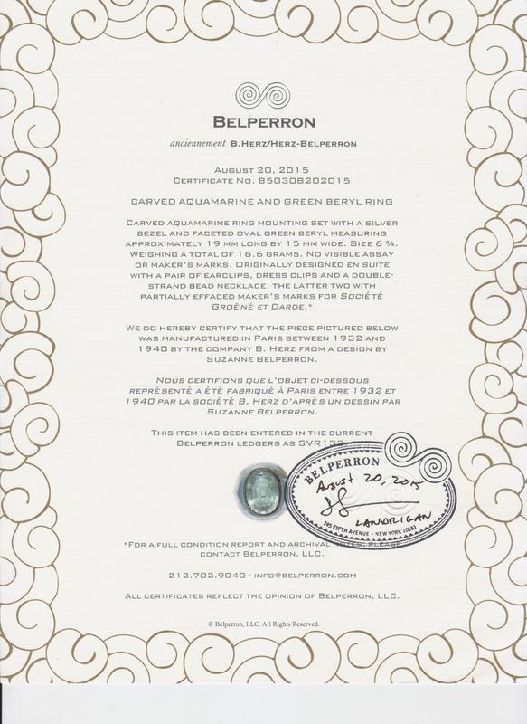 attributed to Suzanne Belperron, consisting of an oval mixed cut green beryl measuring approximately 18.30 x 14.20 mm set in a silver bezel mounted within a carved light blue translucent aquamarine base.Accompanied by a Belperron certificate of authenticity, numbered B50308202015, stating that this ring, number SVR133, is the work of Suzanne Belperron and was most likely created between 1932 and 1940 by the company B. Herz from a design by Suzanne Belperron.