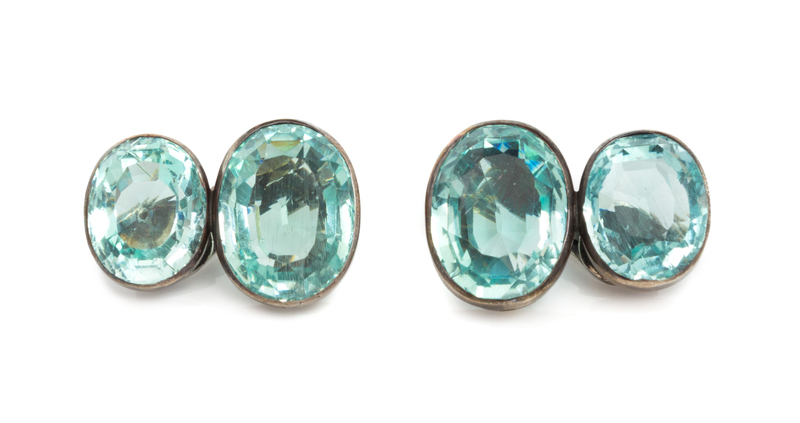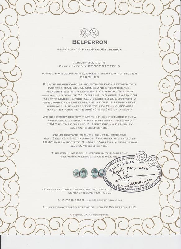 attributed to Suzanne Belperron, containing four oval shape mixed cut green beryl and aquamarines measuring approximately 14.45 x 10.67 mm to 18.40 x 12.89 mm.Stamp: .92.Accompanied by a Belperron certificate of authenticity, numbered B500008202015, stating that these earclips, number SVEC48, is the work of Suzanne Belperron and was most likely created between 1932 and 1940 by the company B. Herz from a design by Suzanne Belperron.