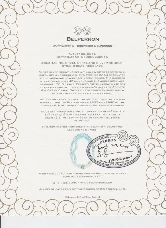 containing round and oval polished aquamarine and green beryl beads measuring approximately 7.50-12.97 mm in diameter, strung knotted with a silver clasp containing a bezel set oval mixed cut green beryl measuring approximately 20.70 x 14.00 x 11.93 mm.Stamp: (Partially obscured maker's mark for Gron et Darde) (French assay mark).Accompanied by a Belperron certificate of authenticity, numbered B50208202015, stating that this bead necklace, number SVN28, is the work of Suzanne Belperron and was most likely created between 1932 and 1940 by the company B. Herz from a design by Suzanne Belperron.