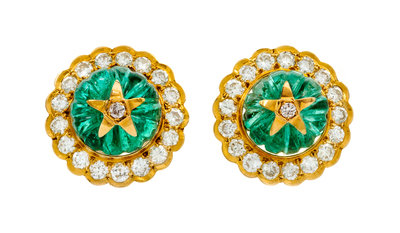 consisting of two round melon form cabochon cut emeralds measuring approximately 10.12-10.64 mm in diameter, the emeralds surmounted and bordered by 36 round brilliant cut diamonds weighing approximately 1.22 carats total. Stamp: 14Kt.