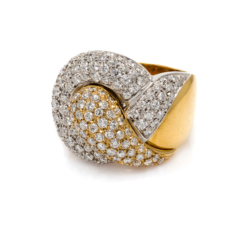 in a knot motif composed of a domed white gold base surmounted with a central yellow gold accent, containing numerous pave set round brilliant cut diamonds weighing approximately 2.79 carats total.