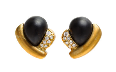 A Pair of 18 Karat Yellow Gold, Onyx and Diamond Earclips, M. Stowe,