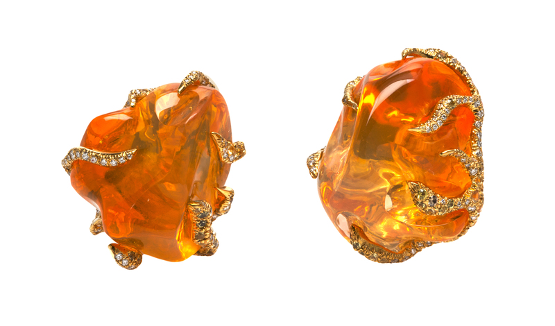 attributed to Dorota, containing two free-form fire opals measuring approximately 25.00 x 19.00 mm and 28.00 x 24.00 mm respectively, numerous round mixed cut yellow sapphires measuring approximately 1.30-1.75 mm in diameter, and approximately 202 round brilliant cut diamonds weighing approximately 0.66 carat total.