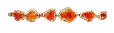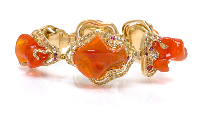 attributed to Dorota, containing six free-form fire opals measuring from approximately 10.11 x 9.74 x 7.38 mm to 25.23 x 20.93 x 10.91 mm, 120 round brilliant cut yellow diamonds (origin of color not tested) weighing approximately 1.20 carats total, 49 round brilliant cut diamonds weighing approximately 0.59 carat total, and 32 round mixed cut reddish purple sapphires measuring approximately 2.25-2.66 mm in diameter.