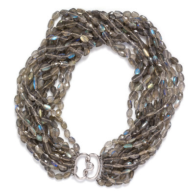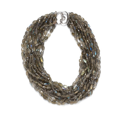 consisting of 11 strands of labradorite beads measuring approximately 8.48 x 6.85 mm to 8.25 x 6.75 mm with a white gold openwork hook clasp.Stamp: 750 Verdura.Accompanied by a pouch signed Verdura.